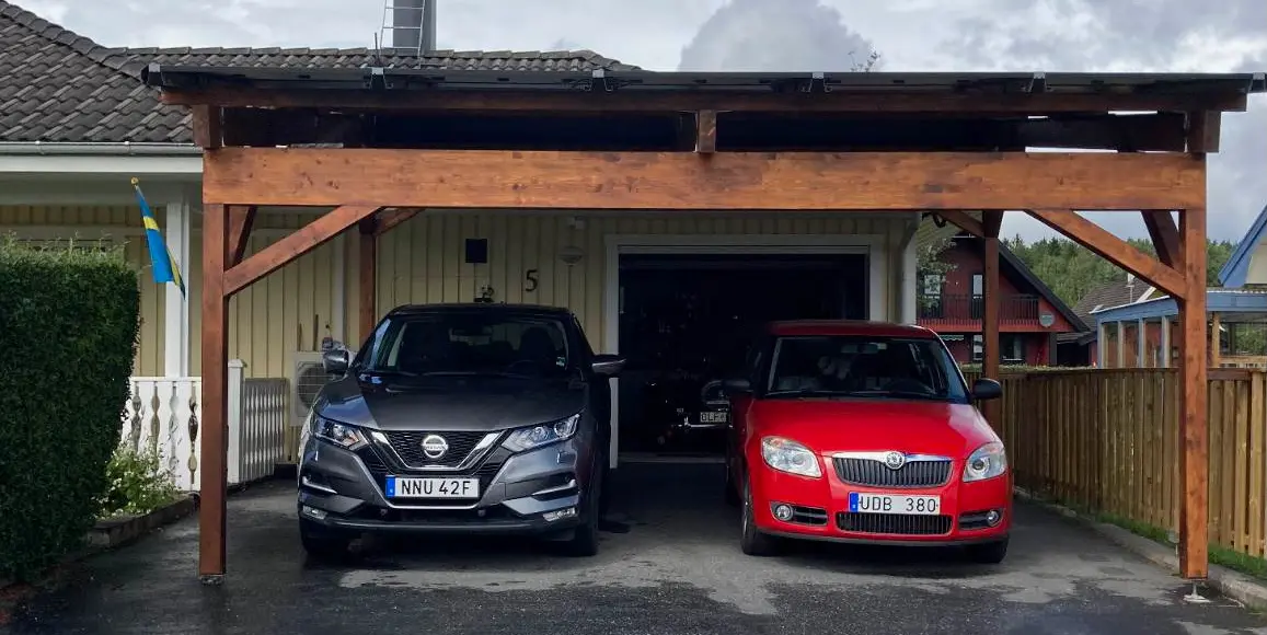 EnbilsCarport För en bil utan bygglov Exempel komplett anläggning: 1,200 Sek per Månad* EnkelCarport (för en bil): CarPort Solcellstak – 4,050 kWp Hybridväxelriktare Batteri –